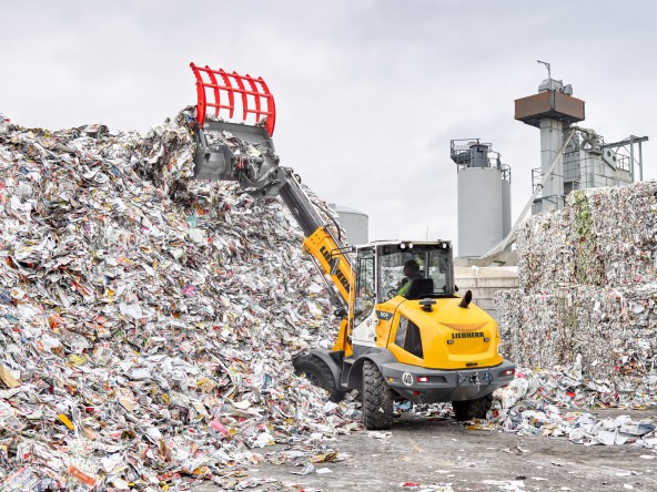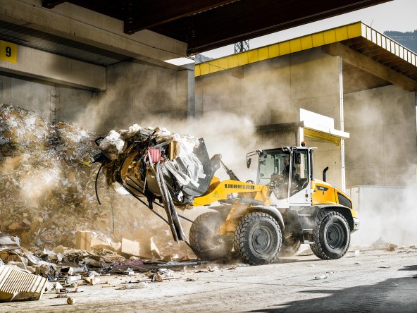 In waste management, machines need to be versatile and resilient. The Liebherr L 509 Tele telescopic wheel loader offers exactly that. With its telescopic lift arms, it can adapt to different requirements and master tasks such as loading high containers with ease. It combines the best of two worlds: the impressive lifting height of a telescopic handler and the heavy handling capacity of a wheel loader. This makes it the ideal partner for daily recycling operations.