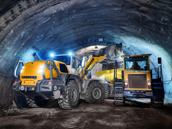 Tunnelling places the highest demands on man and machine. With a special tunnel package, Liebherr wheel loaders are perfectly equipped for underground conditions: Special cabs with toughened glass, LED headlights and dust protection systems. They ensure safe material transportation even in restricted visibility and confined spaces.